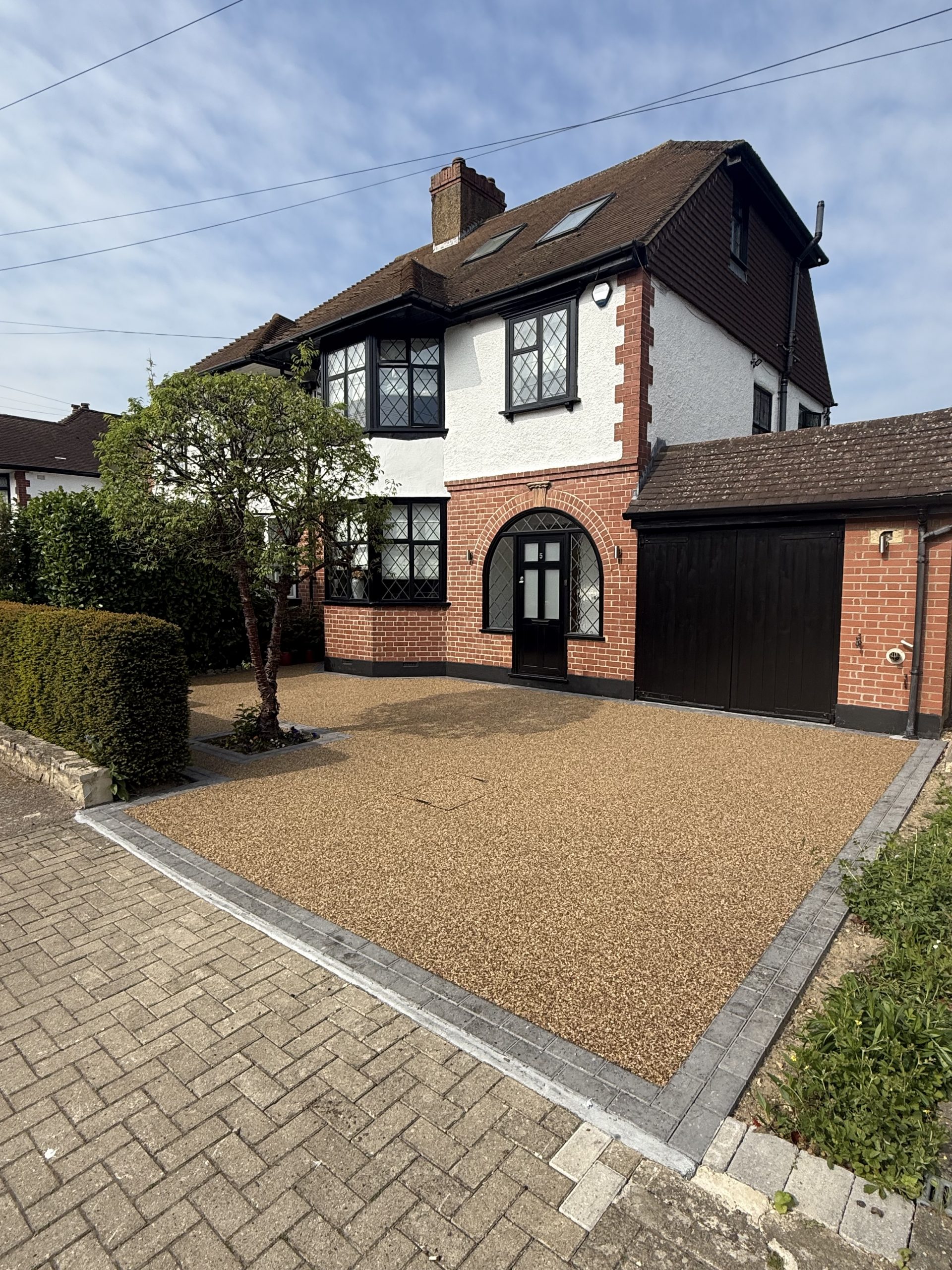 Grey Indian sandstone patio with Staffordshire blue brick planters