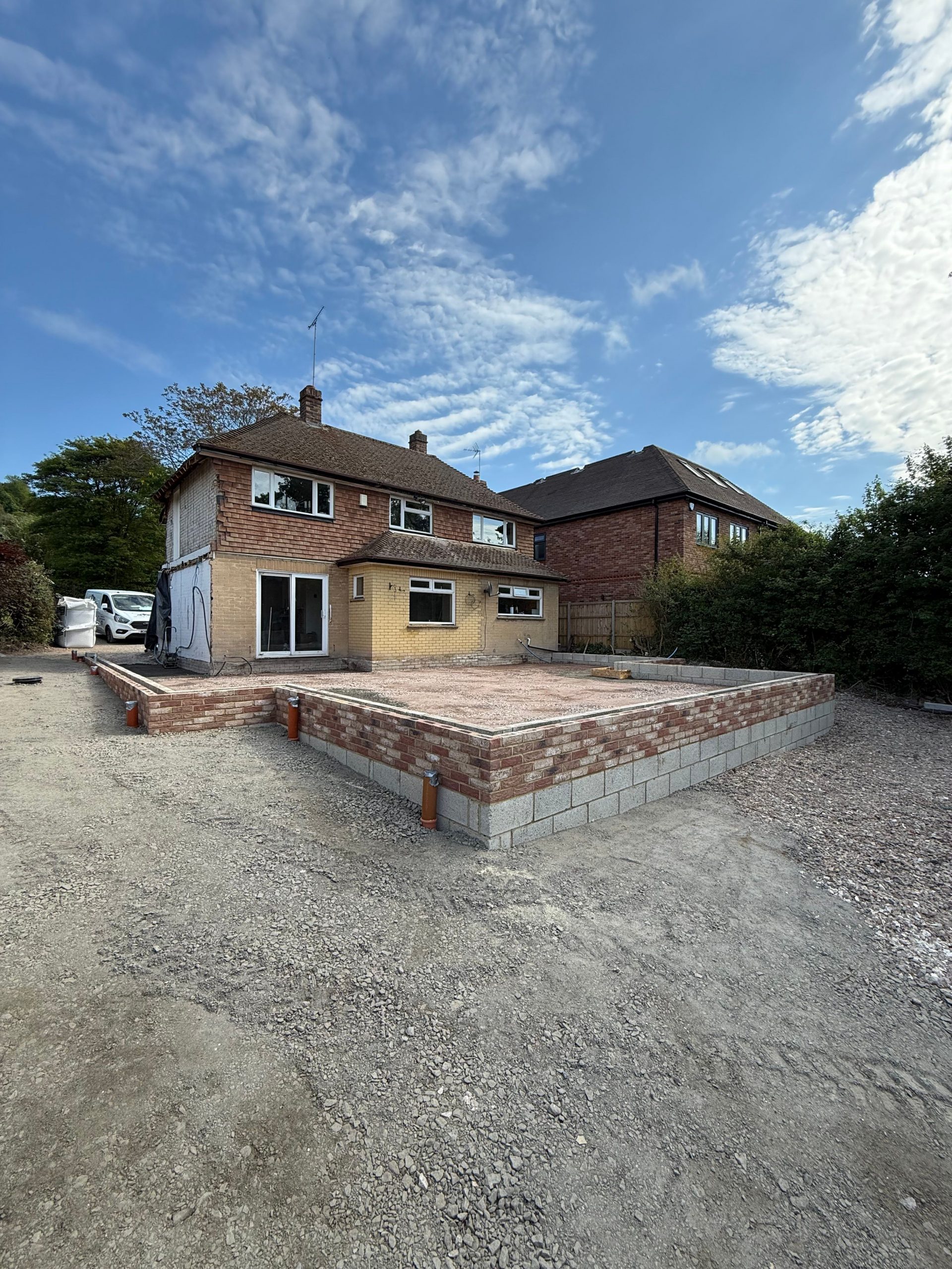 Retaining wall made of steel columns and sleepers with reinforced concrete poured behind. New concrete base with drainage for outbuildings